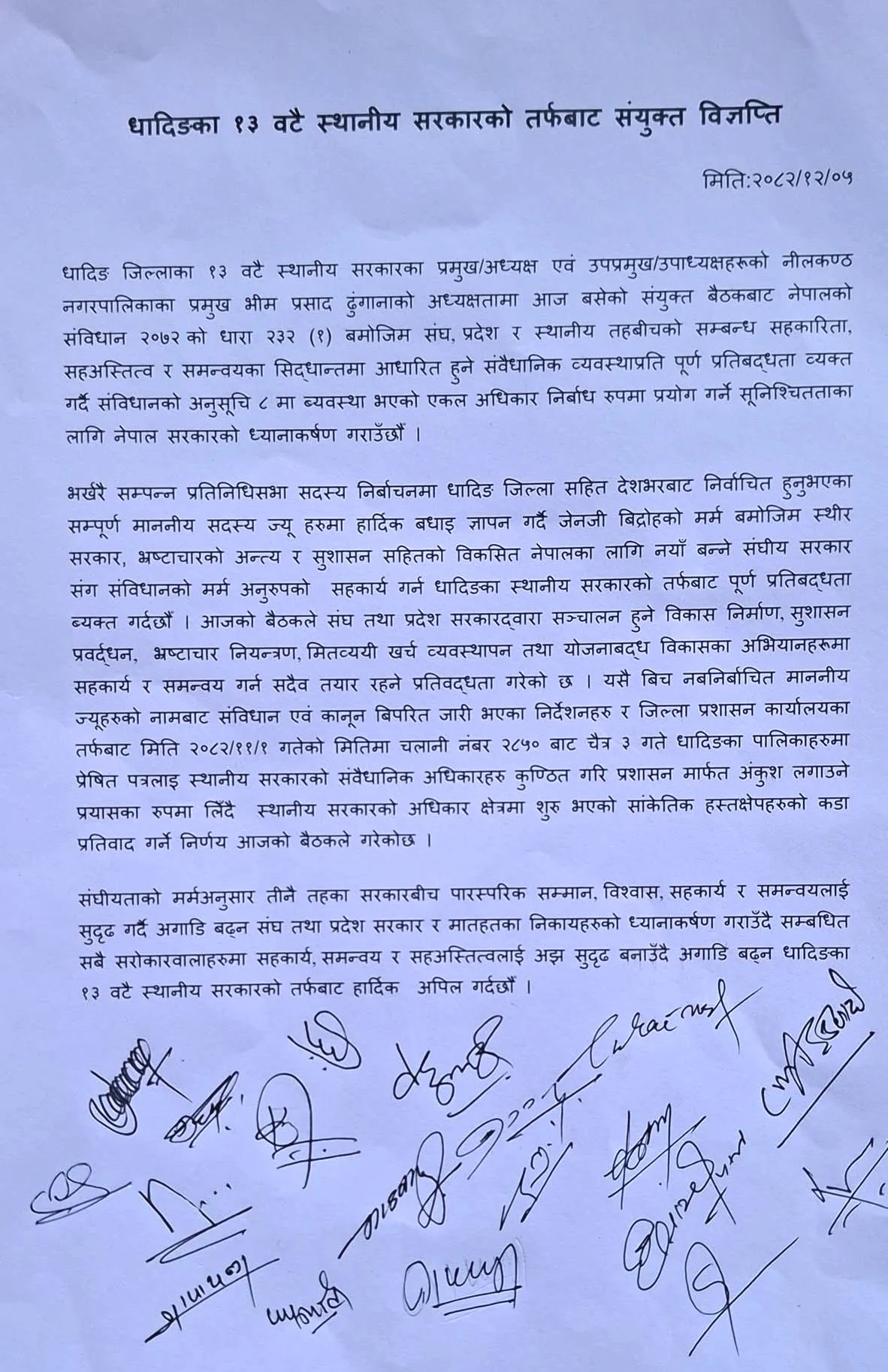 स्थिर सरकार भ्रष्टाचारको अन्त्य र सुशासन सहितको विकसित नेपालका लागि नयाँ बन्ने संघीय सरकारसँग संविधानको मर्म अनुरुपको सहकार्य गर्न धादिङका स्थानीय सरकार पूर्ण प्रतिबद्ध रहेको उनले बताए । ‘तर नवनिर्वाचित सांसदहरूको नामबाट संविधान एवं कानुन विपरीत जारी भएका निर्देशनहरू र जिल्ला प्रशासन कार्यालयका तर्फबाट चैत्र ३ गते धादिङका पालिकाहरुमा प्रेसित पत्रलाई स्थानीय सरकारको संवैधानिक अधिकारहरू कुण्ठित गर्न खोजिएको छ । प्रशासनमार्फत अंकुश लगाउने प्रयास भएका छन् । स्थानीय सरकारको अधिकार क्षेत्रमा सुरु भएको सांकेतिक हस्तक्षेपको कडा प्रतिवाद गर्दछौं । यो १३ वटै स्थानीय तहको निर्णय हो ।’ उनले भने ।