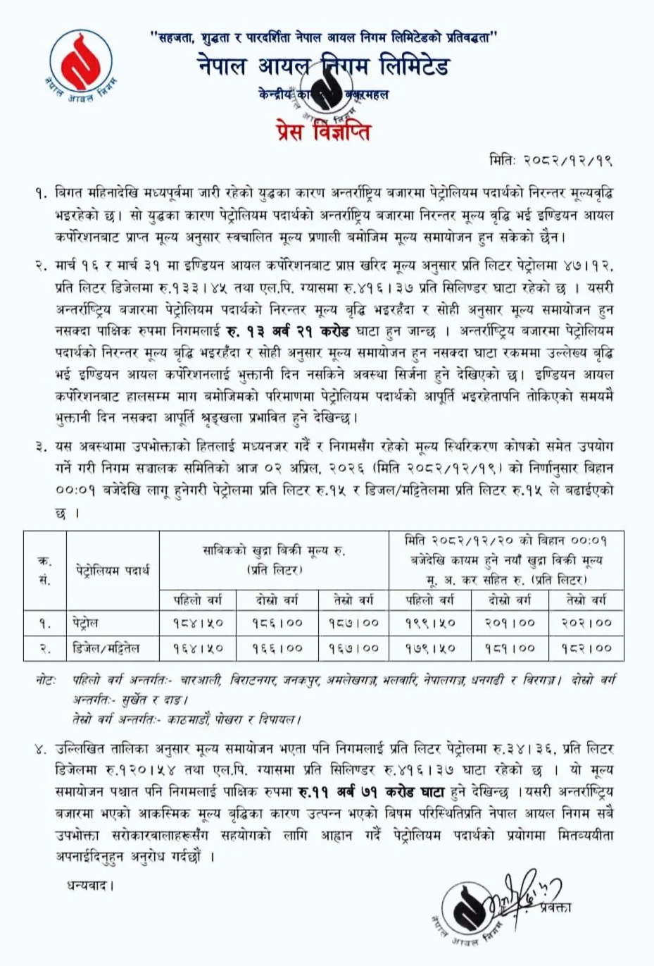 आयल निगमले यो मूल्य समायोजनपछि पनि १५ दिनमा ११ अर्ब ७१ करोड निगमलाई घाटा हुने जनाएको छ ।