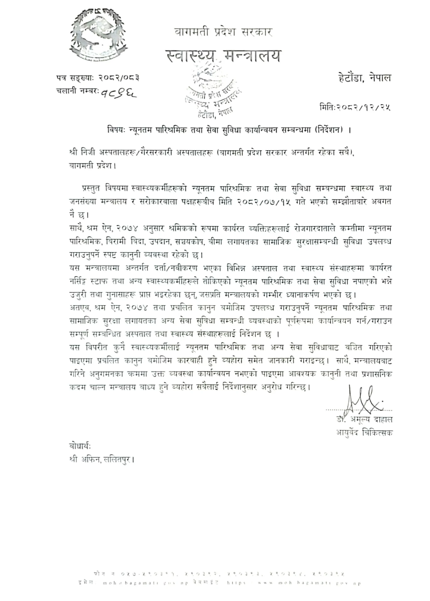 पत्रमा सबै सम्बन्धित अस्पताल तथा स्वास्थ्य संस्थाहरूलाई प्रचलित कानुनबमोजिम न्यूनतम पारिश्रमिक र सामाजिक सुरक्षा सम्बन्धी व्यवस्थाको पूर्ण कार्यान्वयन गर्न निर्देशन दिइएको छ। निर्देशनको पालना नभएमा कानुनी कारबाही गरिने र मन्त्रालयबाट अनुगमन तीव्र पारिने चेतावनी पनि दिइएको छ।